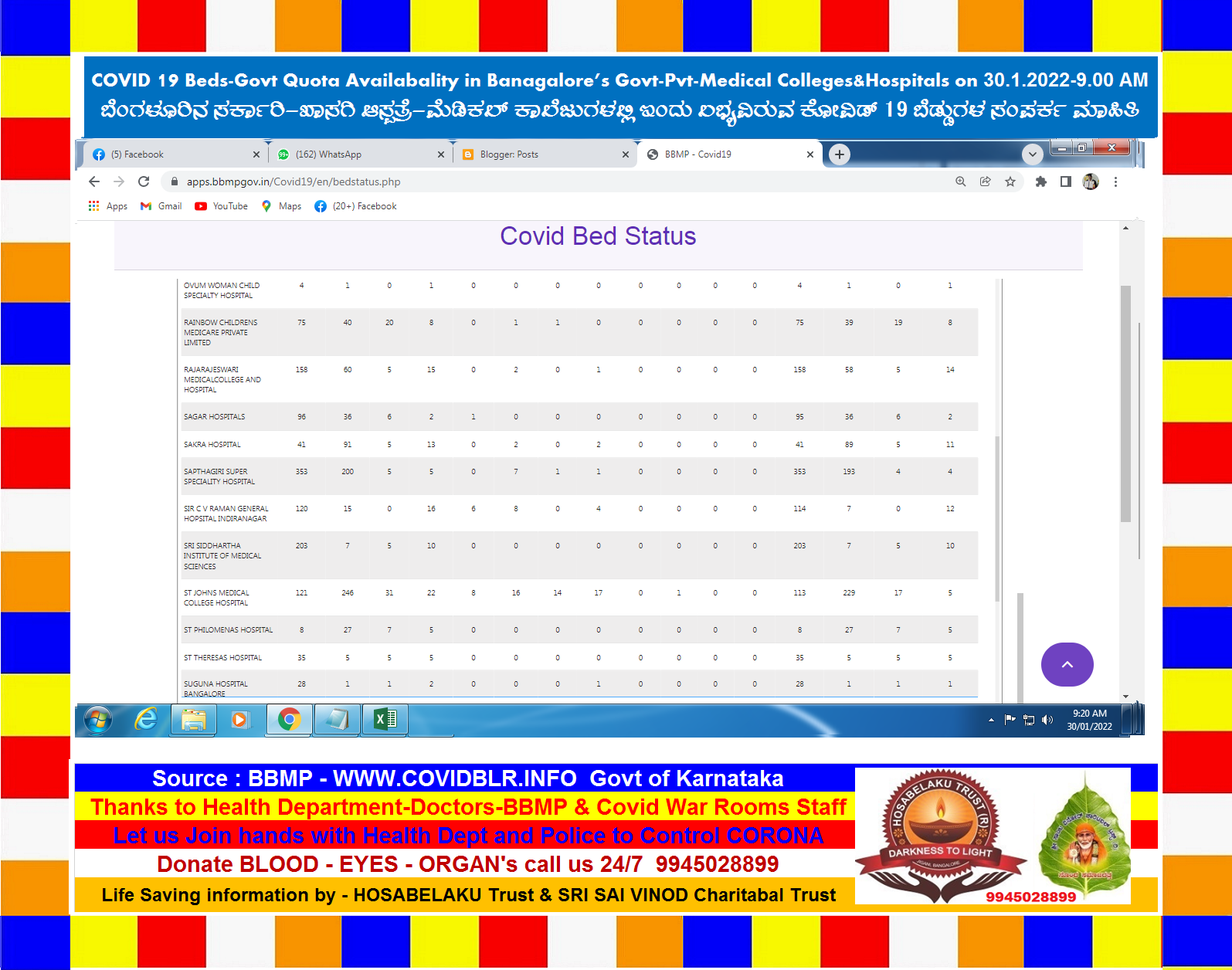 COVID 19 BEDS(Govt Quota) Availabality in Banagalore’s Govt-Pvt-Medical Colleges-Hospitals on 30.1.2022 – 9.00 AM ಬೆಂಗಳೂರಿನ ಸರ್ಕಾರಿ-ಖಾಸಗಿ ಆಸ್ಪತ್ರೆಗಳು-ಮೆಡಿಕಲ್ ಕಾಲೇಜುಗಳಲಿ ಇಂದು ಲಬ್ಯವಿರುವ ಕೋವಿಡ್ 19 ಬೆಡ್ಡುಗಳ ಮಾಹಿತಿ.#Jigani_Ramakrishna #Hosabelaku_Trust #Donate_Organs_Gift_LIFE #9945028899