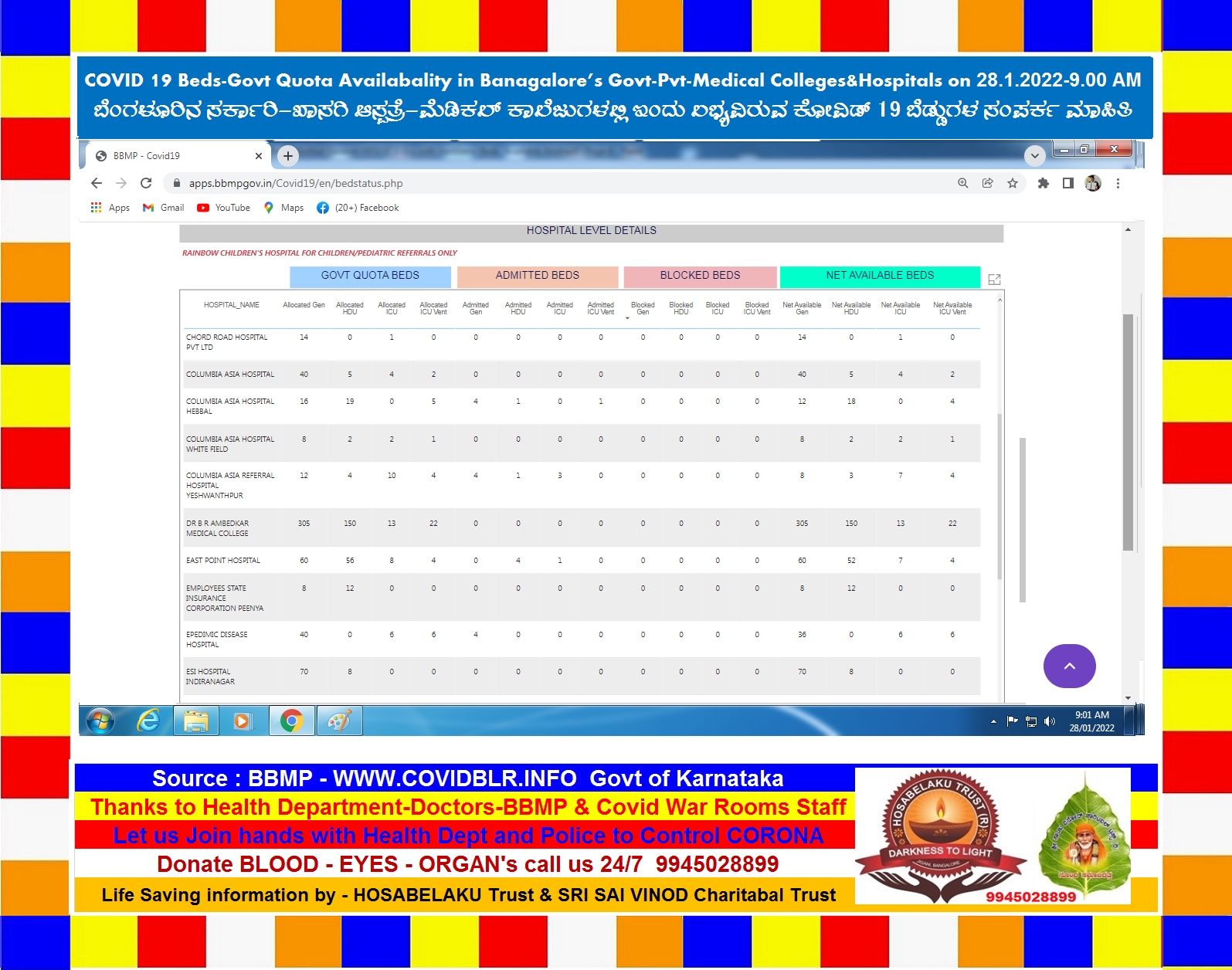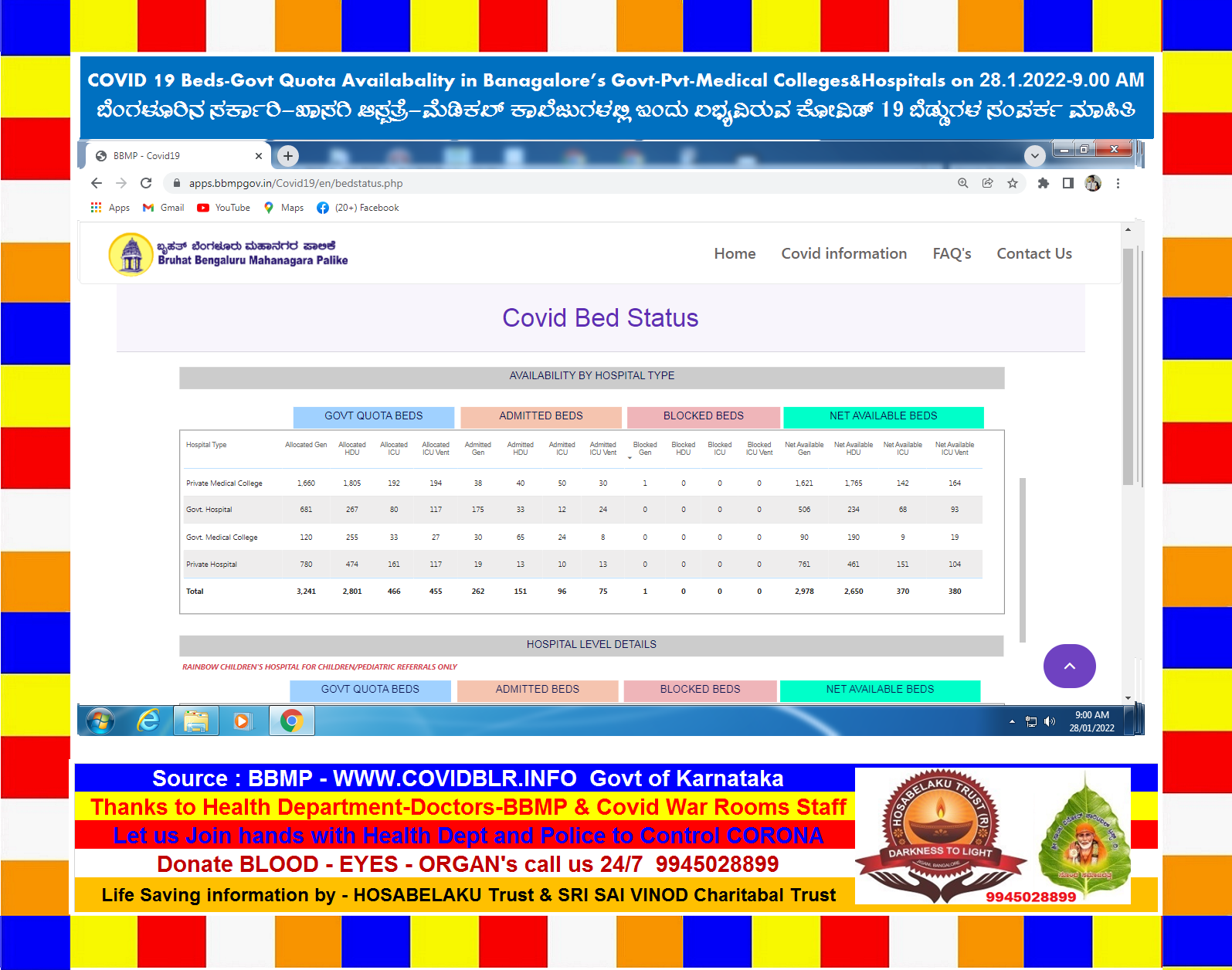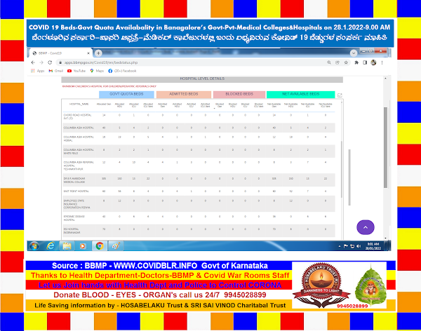 COVID 19 BEDS(Govt Quota) Availabality in Banagalore’s Govt-Pvt-Medical Colleges-Hospitals on 28.1.2022 – 9.00 AM ಬೆಂಗಳೂರಿನ ಸರ್ಕಾರಿ-ಖಾಸಗಿ ಆಸ್ಪತ್ರೆಗಳು-ಮೆಡಿಕಲ್ ಕಾಲೇಜುಗಳಲಿ ಇಂದು ಲಬ್ಯವಿರುವ ಕೋವಿಡ್ 19 ಬೆಡ್ಡುಗಳ ಮಾಹಿತಿ.#Jigani_Ramakrishna #Hosabelaku_Trust #Donate_Organs_Gift_LIFE #9945028899