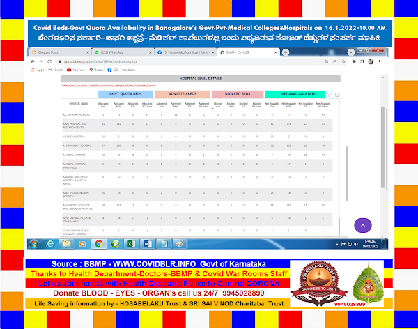 COVID BEDS(Govt Quota) Availabality in Banagalore’s Govt-Pvt-Medical Colleges-Hospitals on 16.1.2022 – 10.00 AM ಬೆಂಗಳೂರಿನ ಸರ್ಕಾರಿ-ಖಾಸಗಿ ಆಸ್ಪತ್ರೆಗಳು-ಮೆಡಿಕಲ್ ಕಾಲೇಜುಗಳಲಿ ಇಂದು ಲಬ್ಯವಿರುವ ಕೋವಿಡ್ ಬೆಡ್ಡುಗಳ ಮಾಹಿತಿ.#Jigani_Ramakrishna #Hosabelaku_Trust #Donate_Organs_Gift_LIFE #9945028899