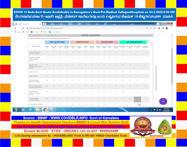 COVID 19 BEDS(Govt Quota) Availabality in Banagalore’s Govt-Pvt-Medical Colleges-Hospitals on 24.2.2022 – 9.00 AM ಬೆಂಗಳೂರಿನ ಸರ್ಕಾರಿ-ಖಾಸಗಿ ಆಸ್ಪತ್ರೆಗಳು-ಮೆಡಿಕಲ್ ಕಾಲೇಜುಗಳಲಿ ಇಂದು ಲಬ್ಯವಿರುವ ಕೋವಿಡ್ 19 ಬೆಡ್ಡುಗಳ ಮಾಹಿತಿ.#Jigani_Ramakrishna #Jigani_Vinod #Hosabelaku_Trust #Sri_Sai_Vinod_Charitable_Trust #Donate_Organs_Eyes_Gift_LIFE #9945028899